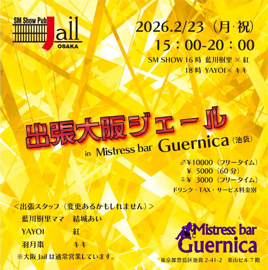 池袋駅西口から徒歩5分の『Mistress bar Guernica 』は「SM」✕「キャバクラ」をコンセプトとしており、キャバクラ以上の経験ができるお店です。ゲルニカではフェティッシュな話はもちろん、緊縛、鞭、蝋燭等のSM体験全般を追加料金なしで広い空間を活用しプレイ体験できます。ゲルニカには個性豊かなキャストが在籍しているので『SMバーが初めての方』も『ベテランの方』も楽しめるお店です。また、Guernicaではイベント日を除く毎日でSMショーを行なっています。 Tokyo SM-themed bar.Enjoy drinks with our unique staff.Staff drinks separate. 20+ only.Occasional live shows (not daily).Our bar offers a unique SM-themed atmosphere and conversations with our staff.Staff drinks are charged separately. Must be 20 or older to enter.We occasionally host live shows, but not every day.Please check our social media for event info.Guernica also holds SM shows every day except on event days. Enjoy! Mistress bar Guernica ゲルニカで刺激的な非日常の空間をお楽しみください。皆様のお越しをお待ちしております。
