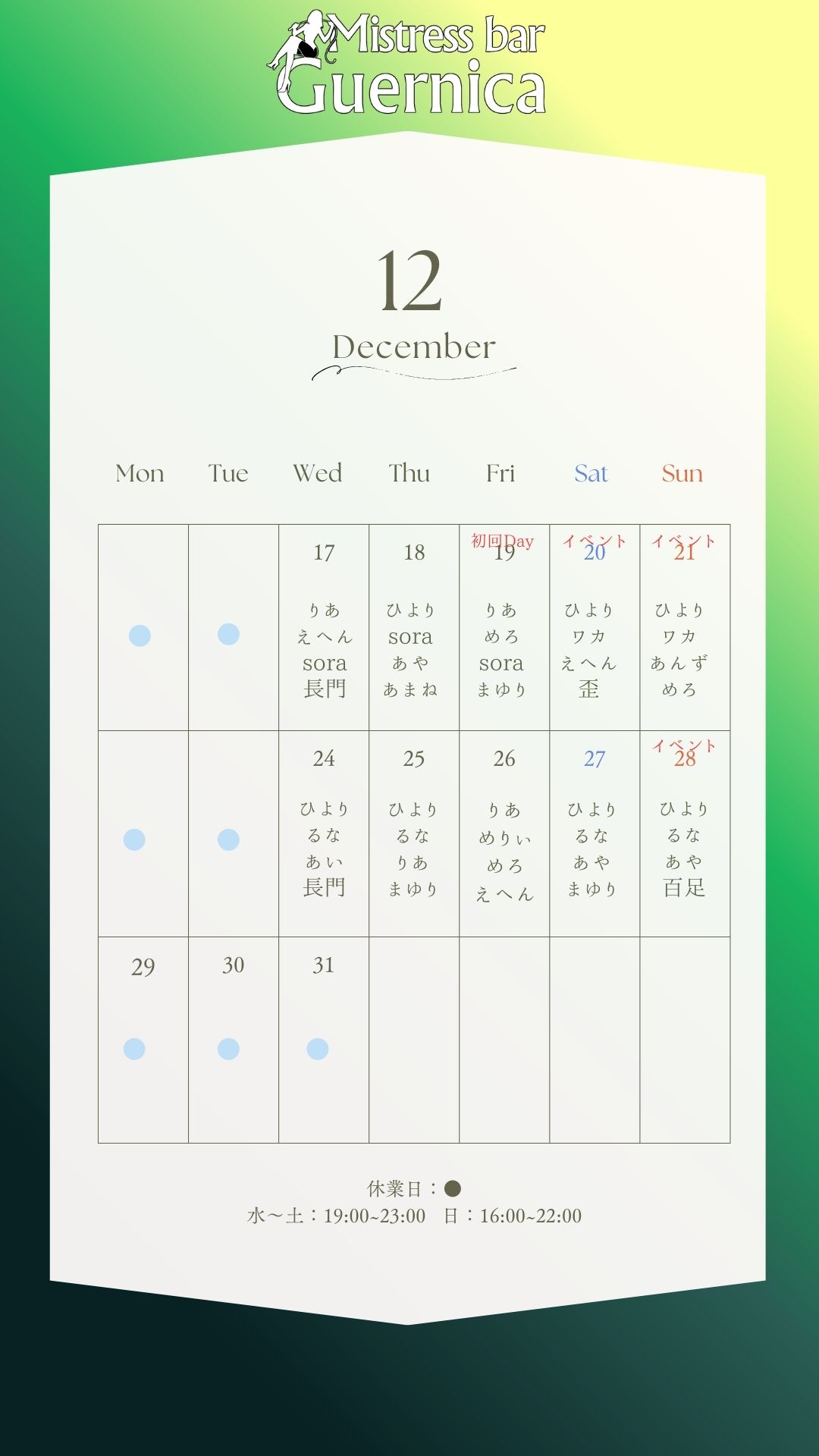※イベントの告知、営業日時のご確認は公式X(Twitter)やInstagram、カレンダーでご確認ください。
